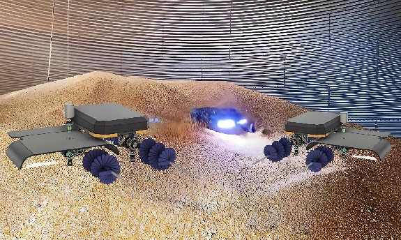 自適應底盤設計:針對糧食流動性特點,采用特殊履帶設計,防止機器人陷入糧堆
